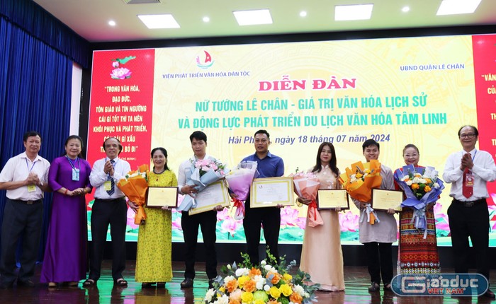 Nhân dịp này, Viện phát triển Văn hóa Dân tộc trao tặng Chứng nhận không gian văn hóa tín ngưỡng thờ Mẫu của người Việt cho 02 đền; trao tặng Giấy khen cho 15 nghệ nhân, đồng thầy, thanh đồng và các nhà tài trợ đã có đóng góp tích cực cho Diễn đàn “Nữ tướng Lê Chân – Giá trị văn hóa lịch sử và động lực phát triển du lịch văn hóa tâm linh”.